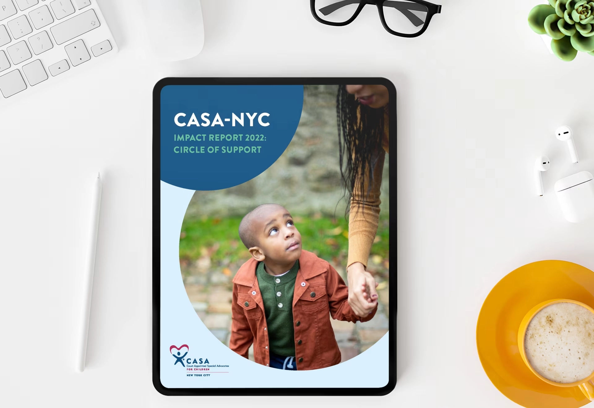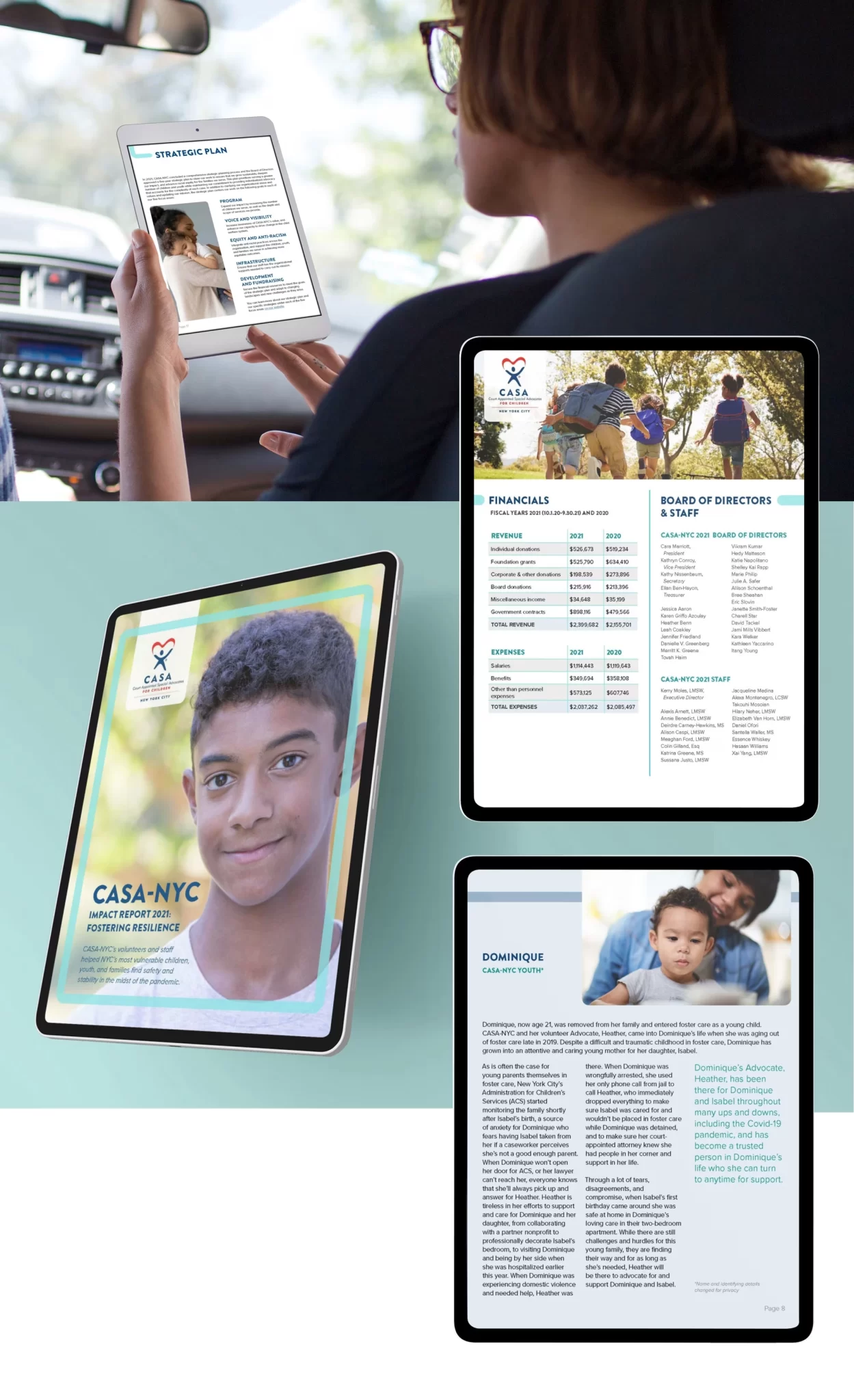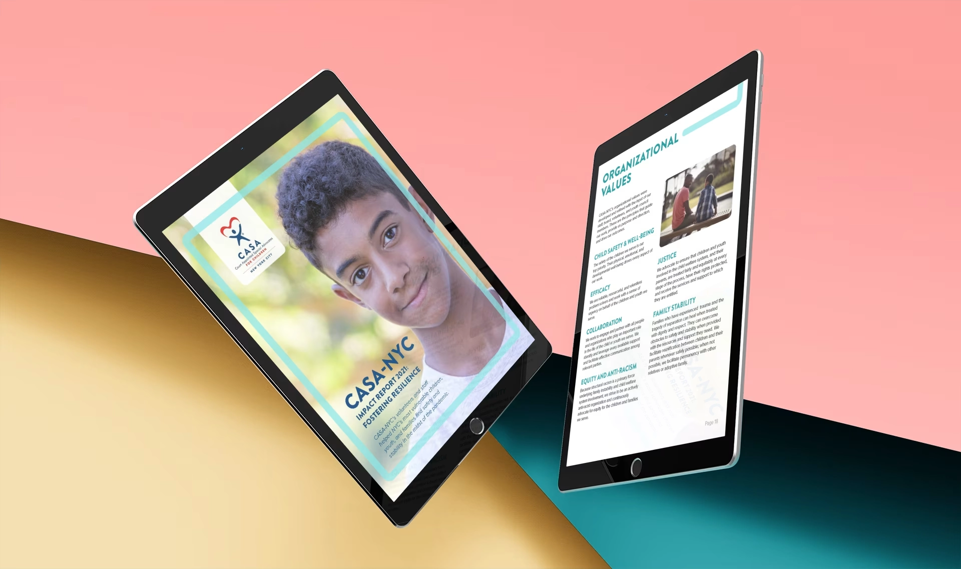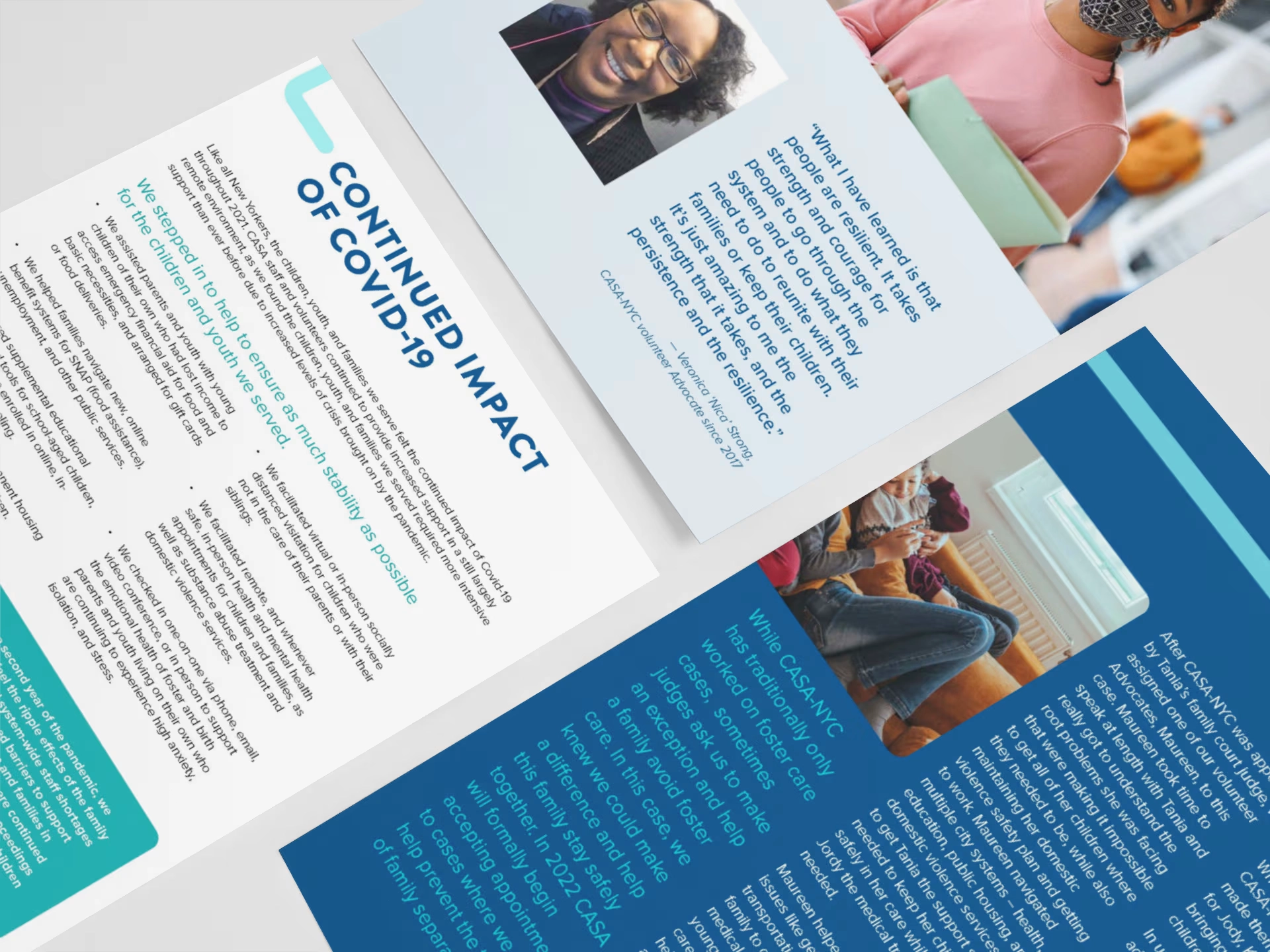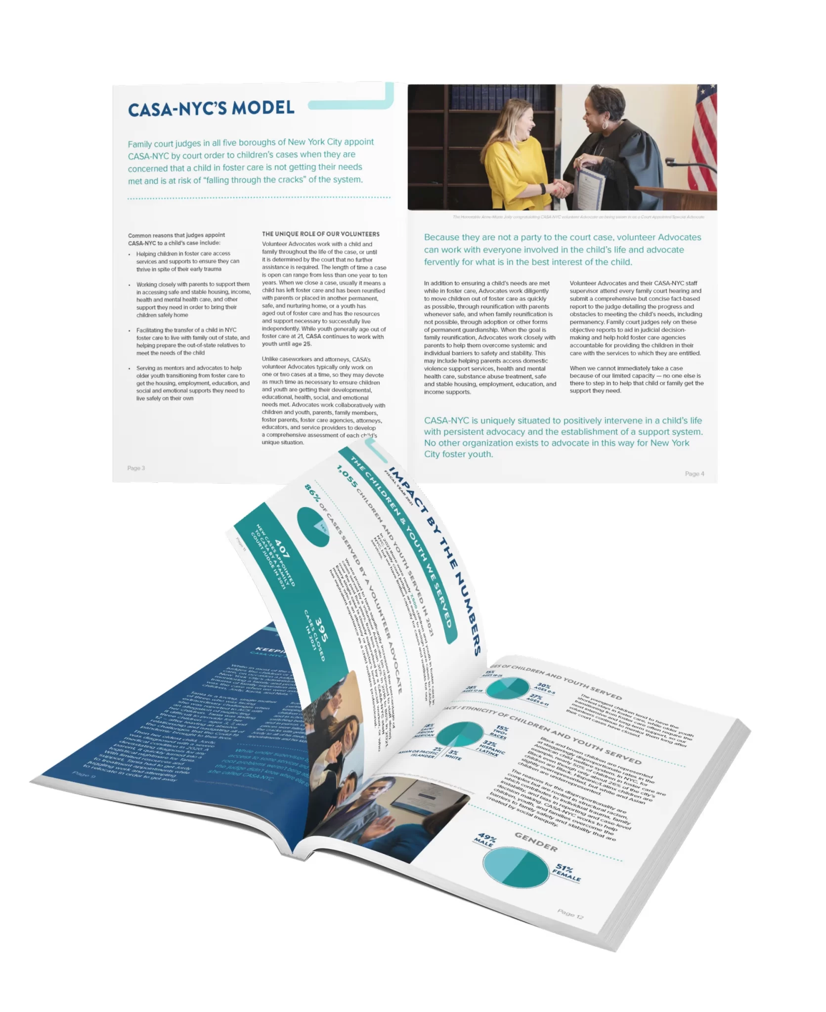 Each section was carefully structured to highlight key data, volunteer contributions, and personal stories, reinforcing the organization’s mission of advocating for children in New York City’s foster care system. The 2021 report successfully modernized CASA-NYC’s visual identity, making it more relatable while maintaining the organization’s credibility. This thoughtful design approach enhanced readability and strengthened CASA-NYC’s connection with its supporters.